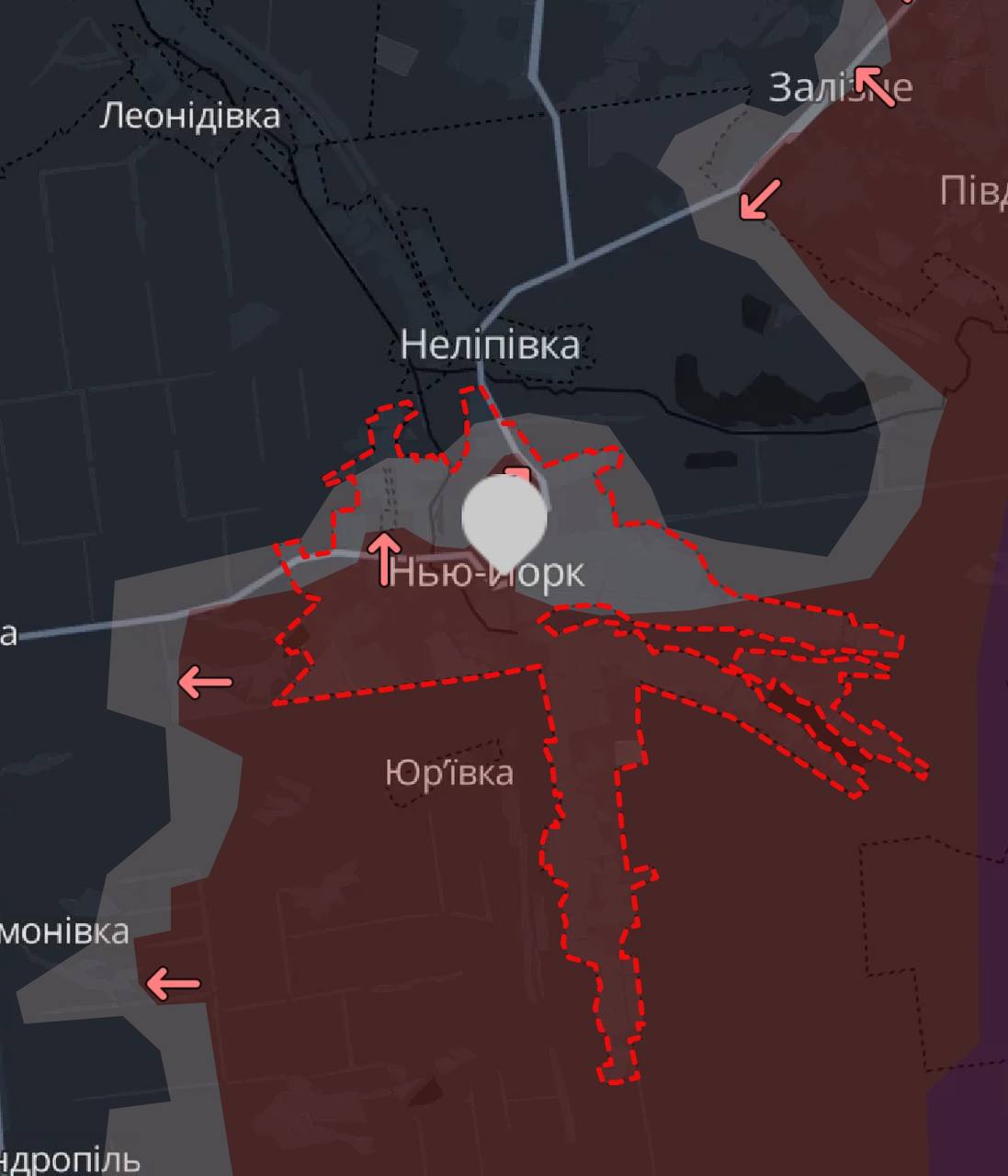 На карте аналитического проекта DeepState часть Нью-Йорка показана под контролем россиян, около половины населенного пункта – в «серой зоне». Карта была обновлена вчера, так что не исключено, что Силы обороны отступили из поселка.