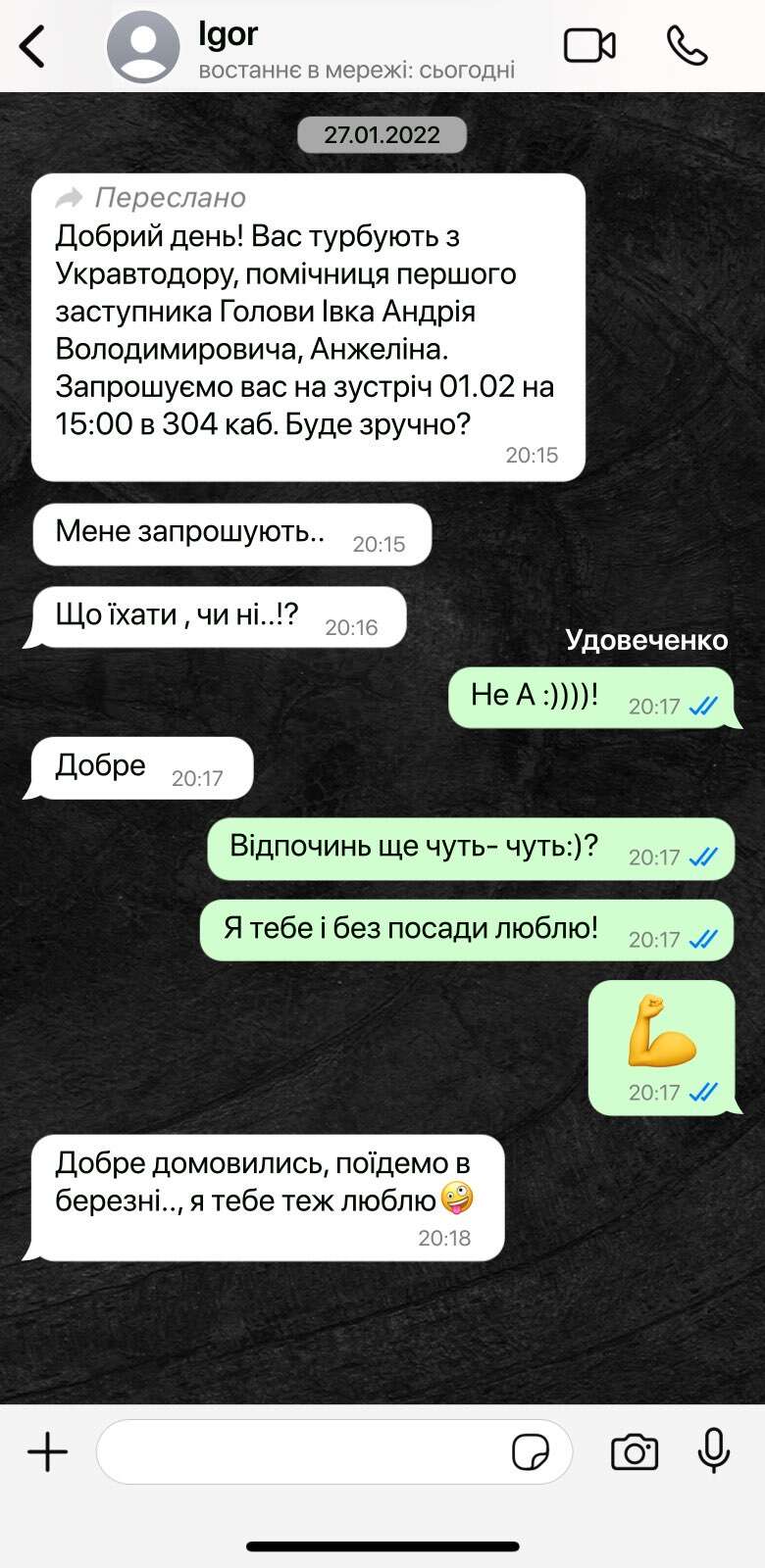В это время между тогда еще кандидатом на должность и Игорем Войтко происходит интересная переписка. Господин Удовиченко делится известием о том, что его пригласили на встречу в Автодор, и интересуется у Игоря Войтка, ехать ли, на что получает не только совет, но и милое признание.