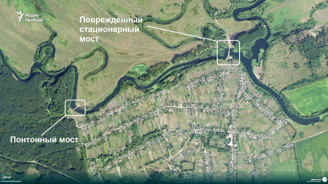Российская армия возвела четвертую понтонную переправу через реку Сейм в Курской области, о чем свидетельствуют спутниковые снимки.