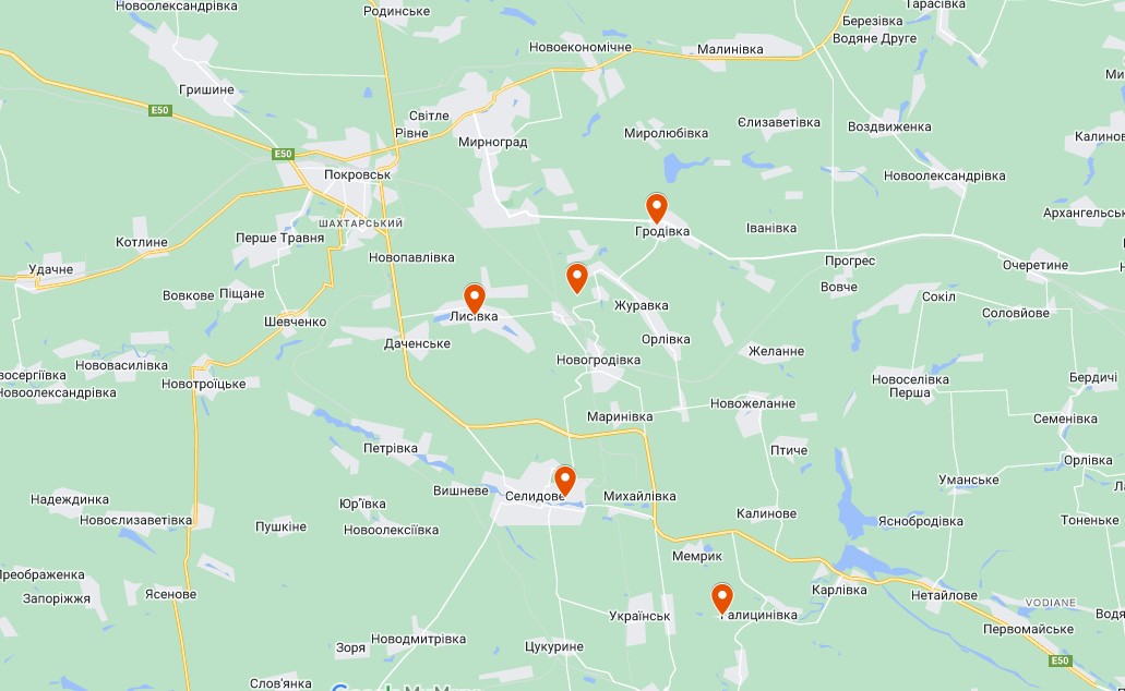 На Google maps можно отметить населённые пункты, о которых упоминал боец. Наблюдаем российский "клин", приближающийся к Покровску и окружающий Селидово.