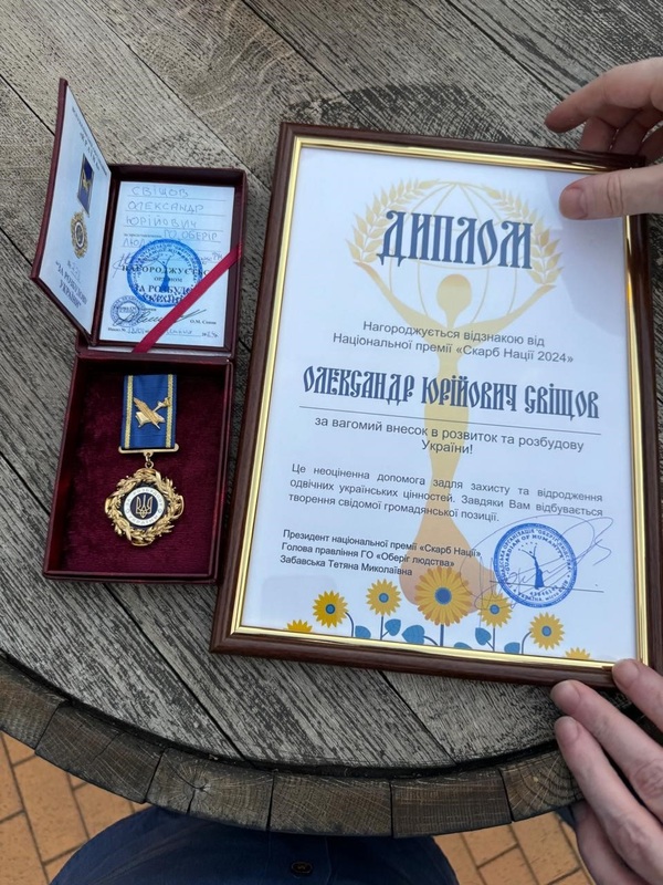 За свою волонтерскую деятельность в поддержку Вооруженных сил Украины и предоставленную гуманитарную и финансовую помощь, Александр Свищев был удостоен "Знака почета" Министерства обороны Украины.