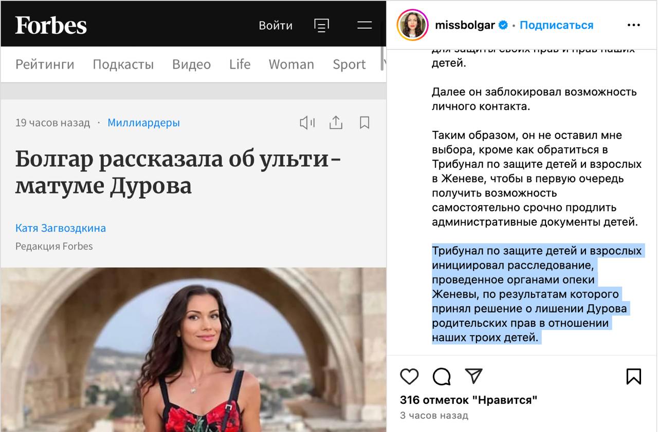 В своем посте в Instagram и интервью Forbes она рассказала, что в конце 2022 года, когда их отношения "уже фактически закончились", Дуров предъявил ей "ультиматум". Он потребовал переезда с детьми в ОАЭ, где сам проживал, заблокировал доступ к картам, с которых она могла тратить до 150 тыс. евро в месяц, перестал оплачивать счета и не подписал согласие на продление европейских иммиграционных документов для детей, "чтобы не дать им шанса остаться в Европе".