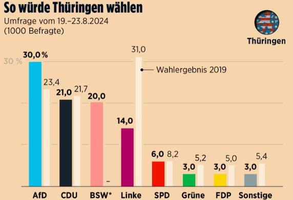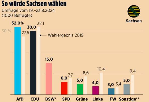 Согласно исследованию, в Саксонии АдГ и BSW суммарно получают 47% голосов, в Тюрингии — 50%. Это означает, что без одной из них невозможно будет сформировать правящую коалицию и новое региональное правительство в Дрездене и Эрфурте.
