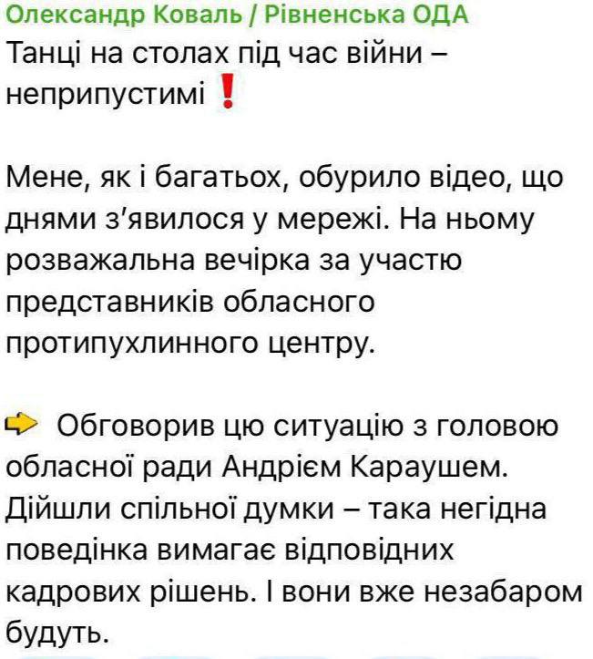 Глава Ровенской ОВА уже отметил, что во время войны танцевать на столах недопустимо, и пообещал «кадровые меры».