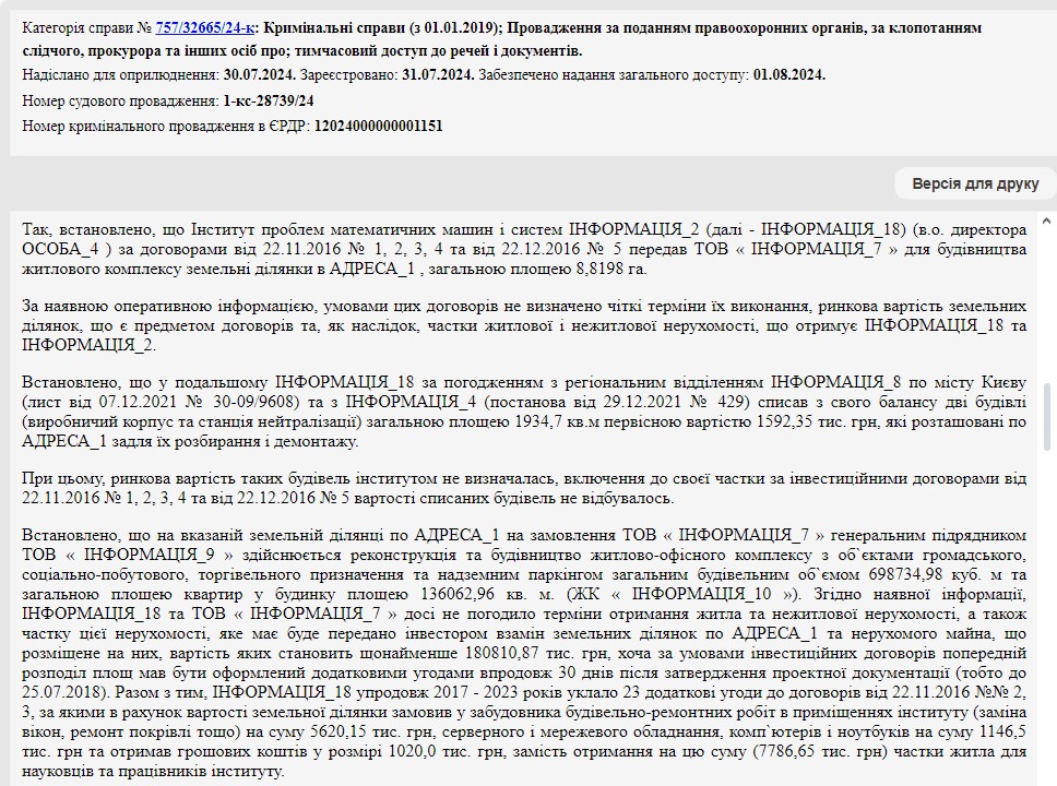 Вместе с тем, по данным Нацполиции, в течение 2017-2023 годов между институтом и указанной компанией было заключено 23 дополнительных соглашения к вышеупомянутым договорам от 22 ноября 2016-го, по которым это заведение НАН Украины заказало у "Укринвеста" строительно-ремонтных работ у своих помещениях (замена окон, ремонт кровли и т.п.) на сумму 5,6 млн гривен, компьютеров, ноутбуков и различного серверного и сетевого оборудования на сумму 1,1 млн гривен, а также получил от этой ООО денежных средств в размере 1,02 млн гривен. Следователи пришли к выводу, что все это фактически было сделано вместо того, чтобы получить от застройщика жилья для ученых и сотрудников института на всю эту сумму – 7,7 млн. гривен.