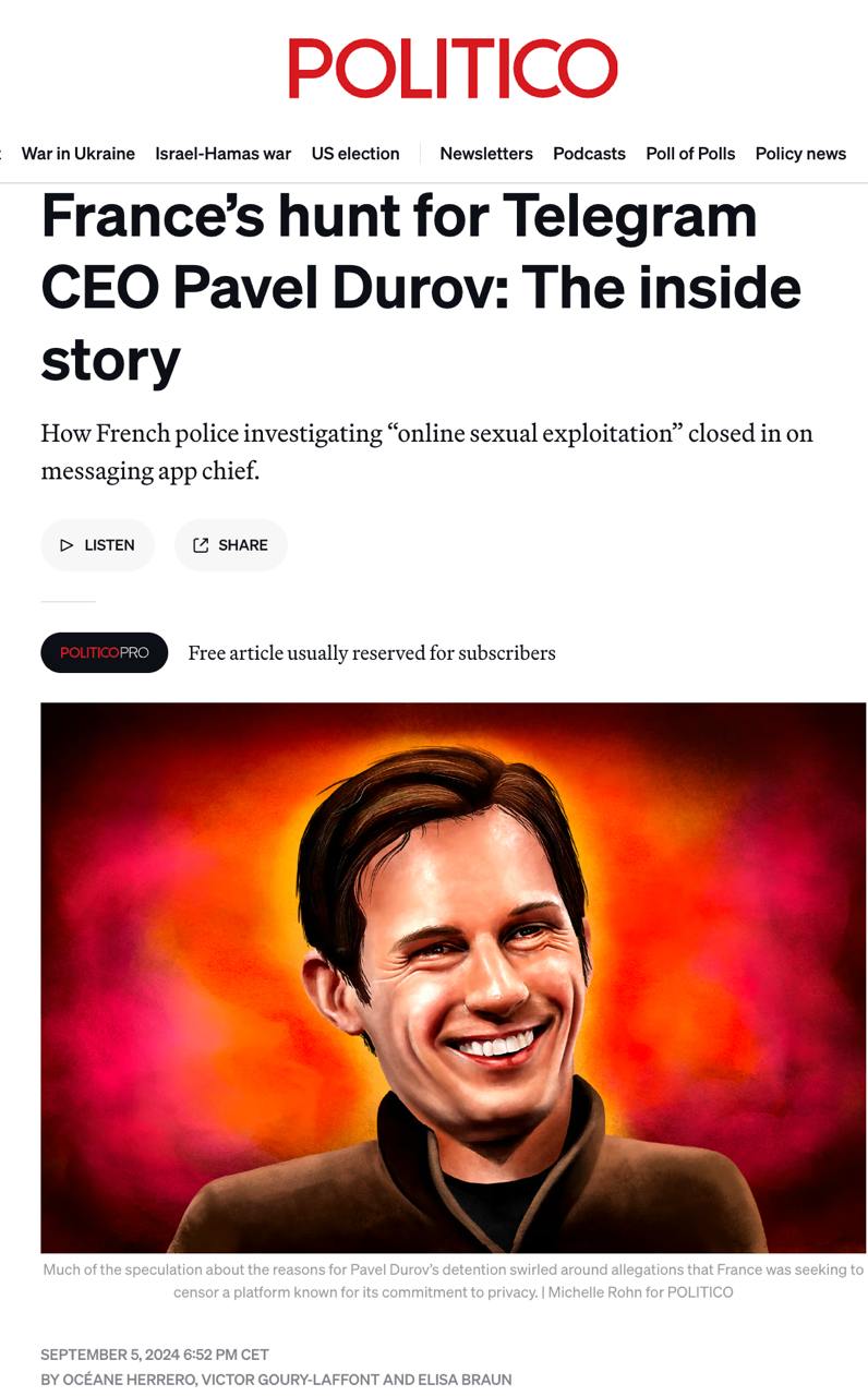 Издание сообщает, что одним из первых заявлений Дурова после задержания в аэропорту Парижа были слова полиции о том, что он прилетел во Францию, чтобы поужинать с Макроном, а снаружи его ожидала машина с водителем. В офисе президента Франции отметили, что он не был уведомлен о приезде Дурова.