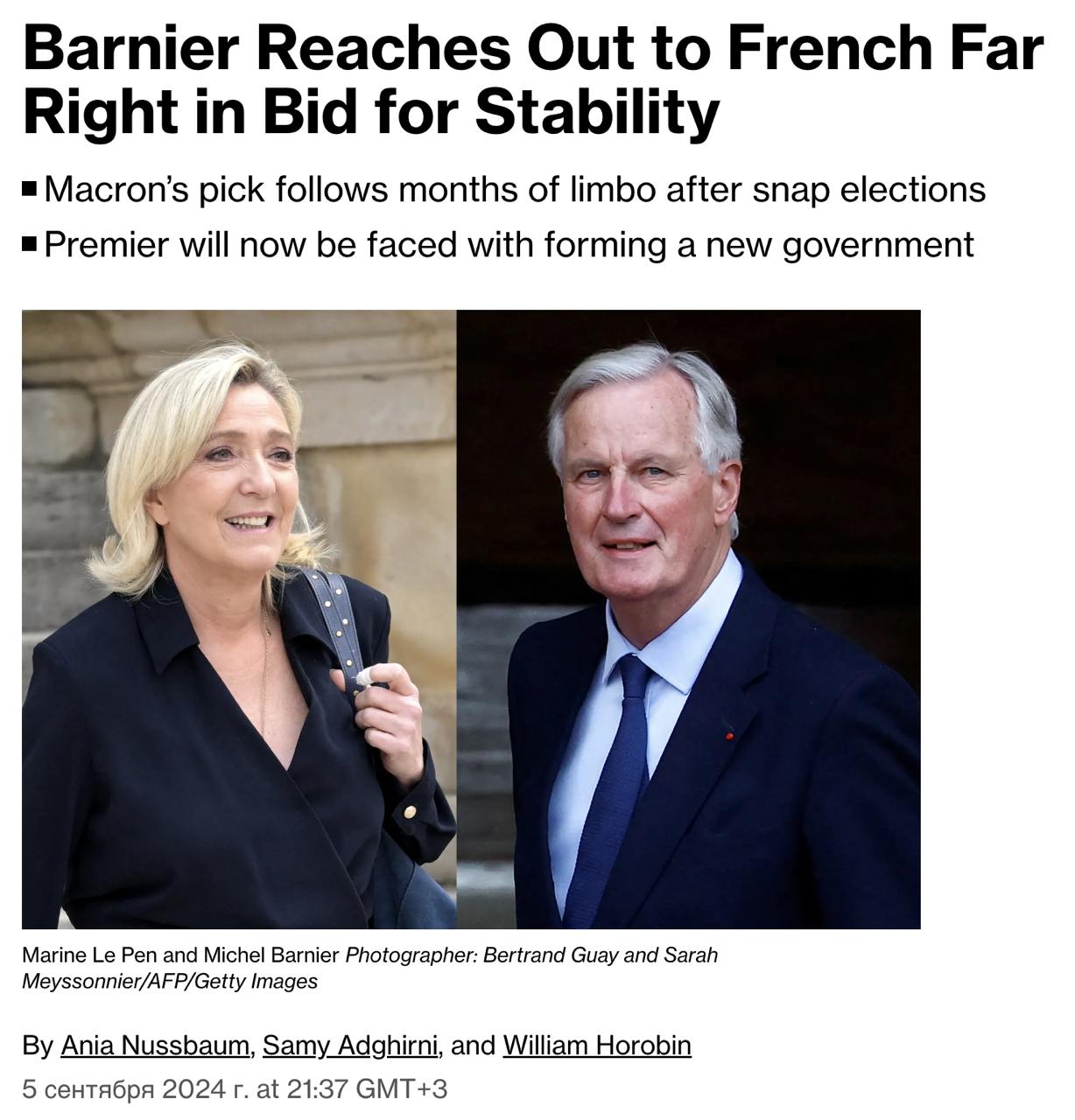 В своем выступлении после назначения Мишель Барнье «пообещал сосредоточиться на вопросах, важных для крайне правых, таких как безопасность и сокращение миграции, в знак уважения к основным приоритетам «Национального объединения» Марин Ле Пен, хотя он и не назвал ее имени», говорится в статье.