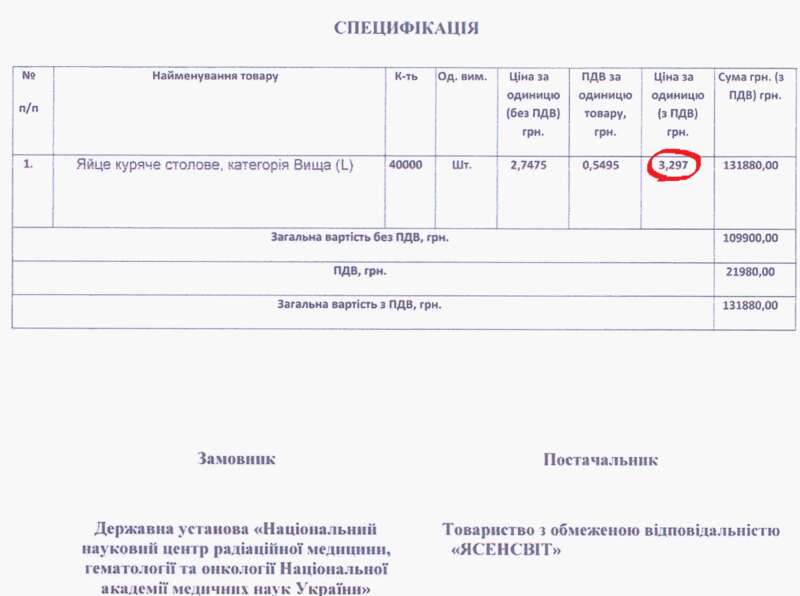 В договоре между "ГОТ" и университетом яйца указаны по 4,80 грн за штуку. При этом «Госоператор тыла» в августе по результатам конкурентных торгов заказал поставку продовольствия для других воинских частей в Киеве. Яйца в контракте с фирмой "Контракт продрезерв 5" были по 3,10 грн за штуку. Что на четверть дешевле контракта университета им. Шевченко, который был заключен без торгов.