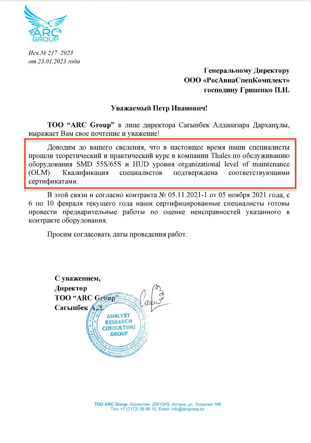 Итак, получив от россиян финансирование, казахстанская консалтинговая компания отправляет своих специалистов на обучение. О сроках обучения руководитель ARC Group сообщает Петру Гриценко в своем письме от 09 декабря 2022 года. Там он прямо указывает, что "с 16 по 20 января 2023 года, в рамках контракта нашей компании с французской компанией Thales, планируется обучение наших специалистов по сервисному обслуживанию различных систем авионики".