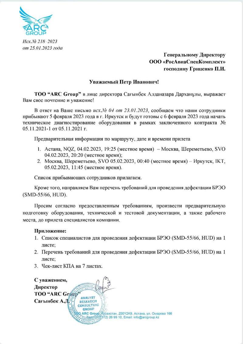 Полная документация, содержащаяся в переписке между ТОО "ARC Group" и АО "Росавиаспецкомплект", будет опубликована вскоре.