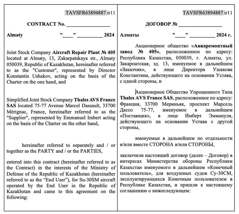 Благодаря одному из источников, предоставивших документы для этого материала, в нашем распоряжении оказался проект контракта между Thales AVS France SAS и АО "Авиаремонтный завод № 405" (Республика Казахстан, г. Алматы, ул. Закарпатская, д. 13).