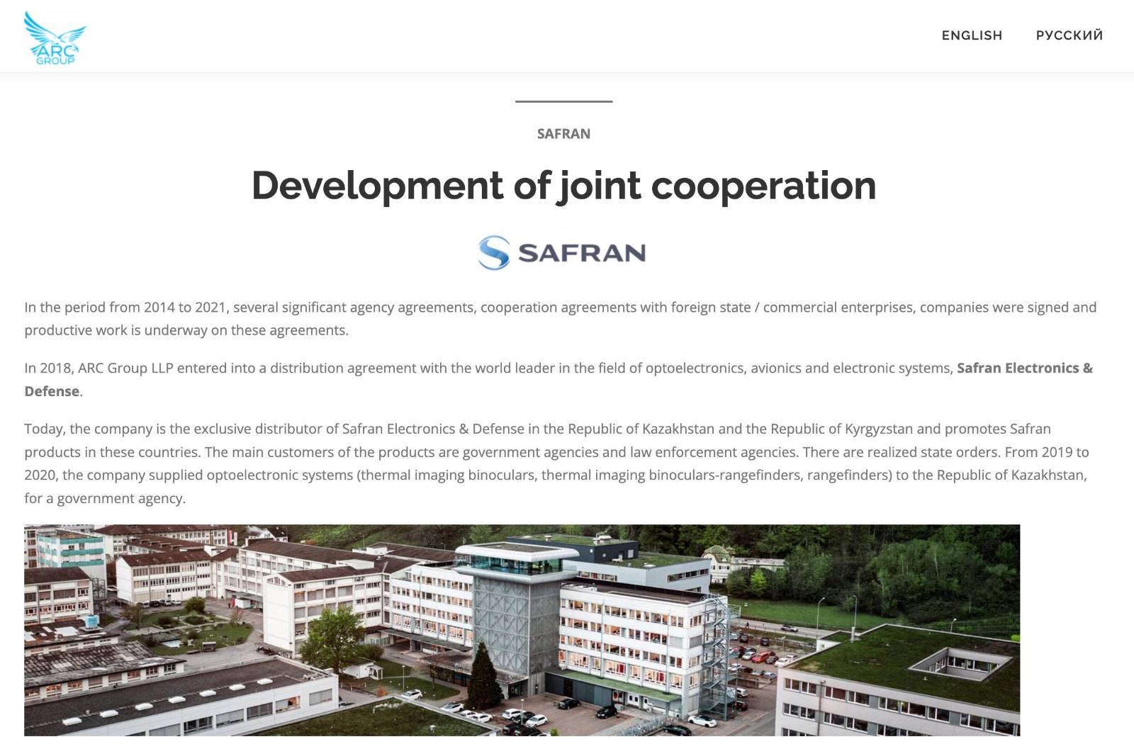 На сегодняшний день компания является эксклюзивным дистрибьютором Safran Electronics & Defense в Республике Казахстан и Республике Кыргызстан и занимается продвижением продукции Safran в этих странах. Основными заказчиками продукции являются государственные и правоохранительные органы. Есть реализуемые государственные заказы. С 2019 по 2020 годы компания поставила оптико-электронные системы (тепловизионные бинокли, тепловизионные бинокли-дальномеры, дальномеры) в Республику Казахстан, для государственного учреждения”.