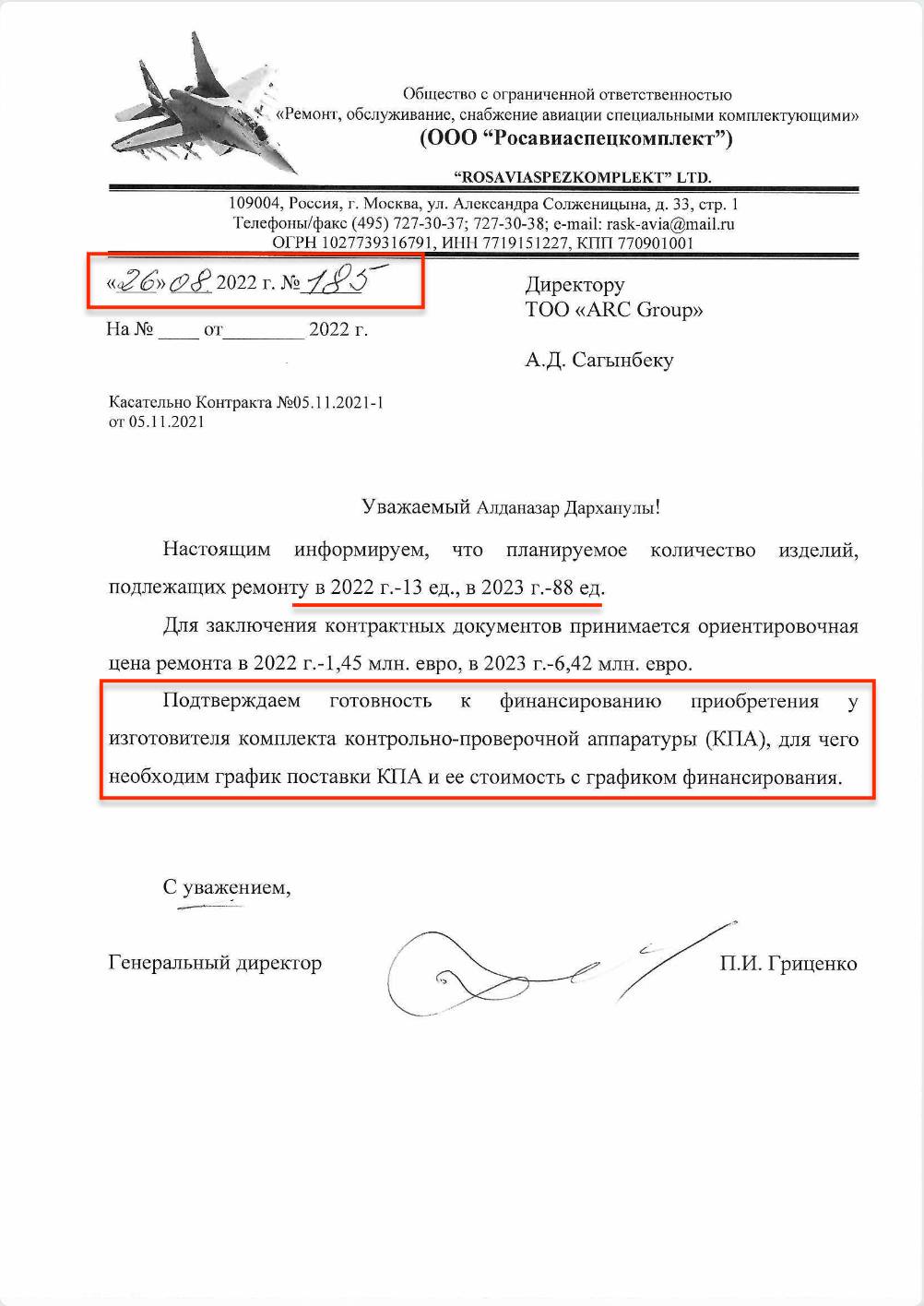 В пользу второго варианта свидетельствует письмо директора "Росавиаспецкомплект" руководителю казахстанской компании от 26 августа 2022 года. В нем руководитель с российской стороны Петр Гриценко информирует визави, что плановое количество изделий, подлежащих ремонту за 2022 год, составляет 13 единиц на ориентировочную сумму 1 450 000 евро, а уже в 2023 году планируется отправить 88 единиц на сумму 6 420 000 евро.