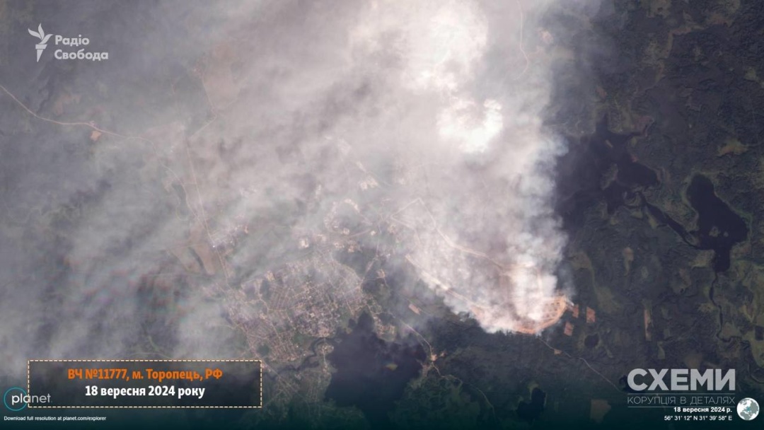 На спутниковых снимках Planet Labs за 18 сентября видно масштабное задымление на территории воинской части №11777, которая отвечает за склад Главного ракетно-артиллерийского управления Министерства обороны РФ.