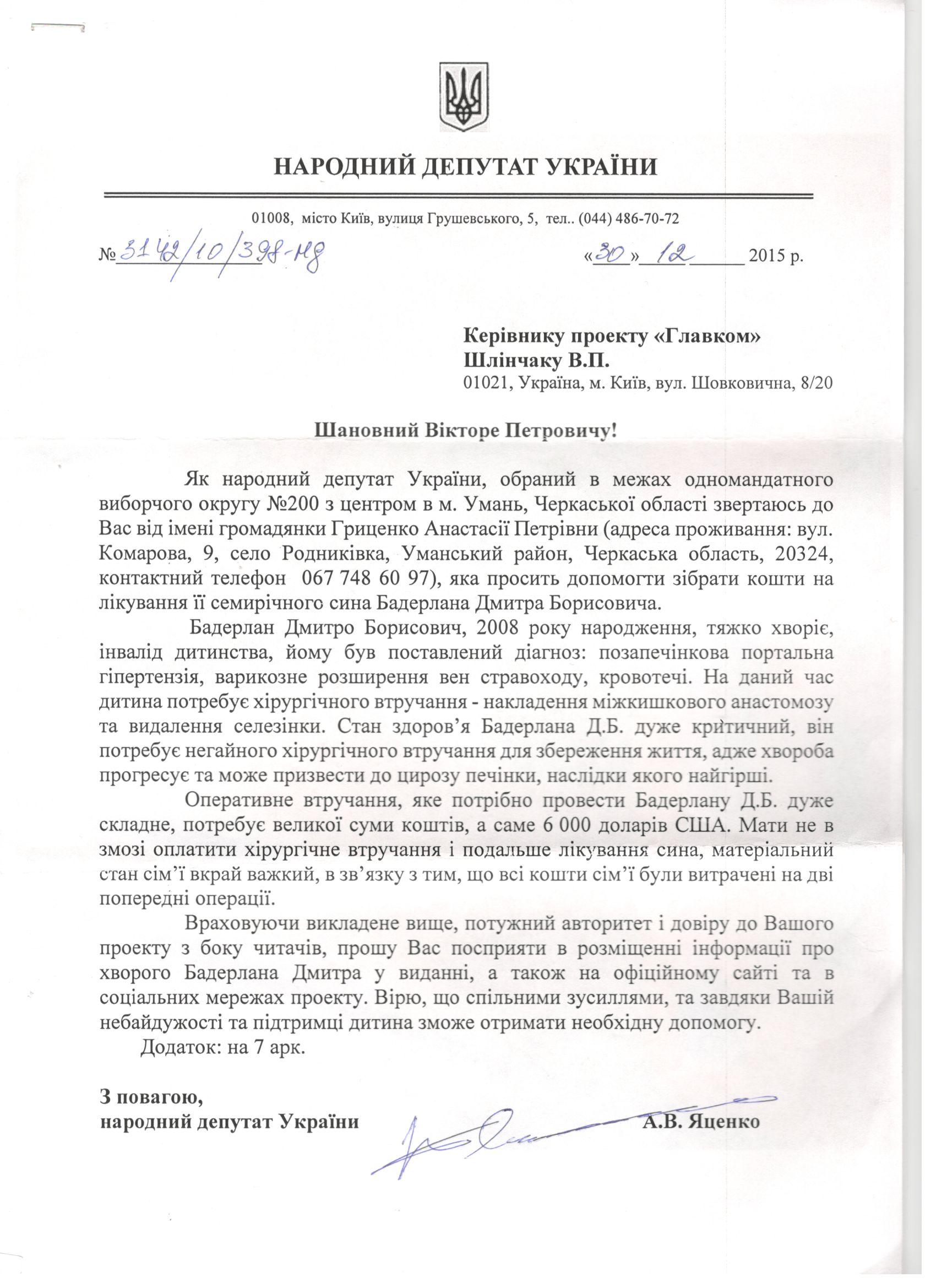 Парламентарий, известный во времена Ющенко-Януковича как воротила в сфере государственных тендеров, теперь рассылает письма с просьбой посодействовать сбору денег, например, на лечение тяжелобольного мальчика Дмитрия Бадерлана, жителя села Родниковка Уманского района. При этом на лечение ребенку необходимо всего лишь 6 тысяч долларов, пишет glavcom.ua