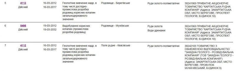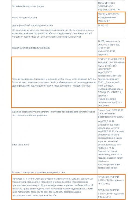 Цікаво, що наразі в Україні видано лише 7̲ ̲с̲п̲е̲ц̲д̲о̲з̲в̲о̲л̲і̲в̲ на вивчення родовищ або видобуток руд дорогоцінних металів. При цьому три дозволи, дію яких тимчасово припинено, але ще не скасовано, належать пов’язаним із Захарченком компаніям. Два дозволи на Мужіївське та Берегівське родовища отримала свого часу "Карпатська рудна компанія", про яку "Слідство.Інфо" і робило розслідування. Третій дозвіл – на вивчення Квасівського рудного поля – було видано "̲З̲а̲х̲і̲д̲н̲і̲й̲ ̲г̲е̲о̲л̲о̲г̲о̲-̲р̲о̲з̲в̲і̲д̲у̲в̲а̲л̲ь̲н̲і̲й̲ ̲к̲о̲м̲п̲а̲н̲і̲ї̲". Її директором та одним із кінцевих власників є вже згаданий Валерій Бредихін.