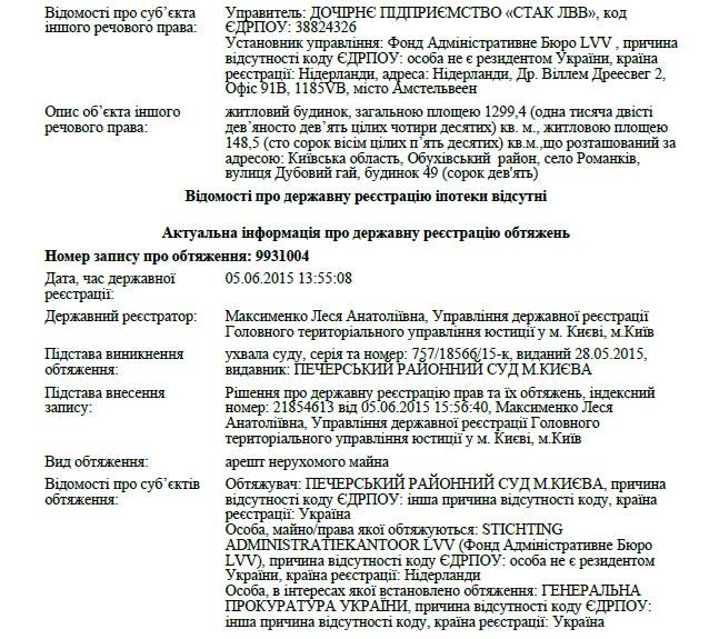 А ще Захарченко міг би сумувати за будинком у Романкові, який в 2012 році переписали з дружини екс-міністра на н̲і̲д̲е̲р̲л̲а̲н̲д̲с̲ь̲к̲и̲й̲ ̲ф̲о̲н̲д̲ ̲L̲V̲V̲. Завдяки відкритій кадастровій карті також виявилося, що фонду LVV належить не лише будинок у Романкові та земля безпосередньо під ним, але й ділянки неподалік - загалом більше 4,8 га! Але от невдача: в червні цього року генпрокуратура все ж наклала арешт на майно фонду, а тому у Романкові на екс-міністра зараз теж не чекають.