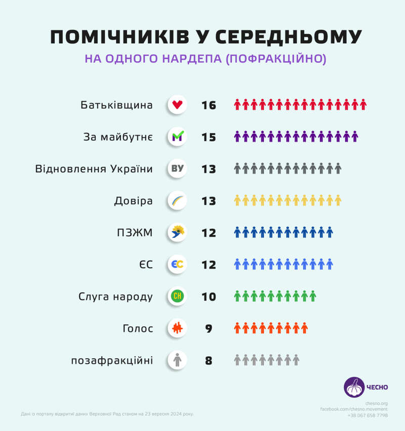 "В среднем у одного народного депутата 11 помощников. Среди фракций больше всего помощников на одного нардепа приходится в "Батьківщині" - 16, в "Европейской солидарности" - 12, 10 в "Слуге народа" и 9 в "Голосе", - отмечается в материале.