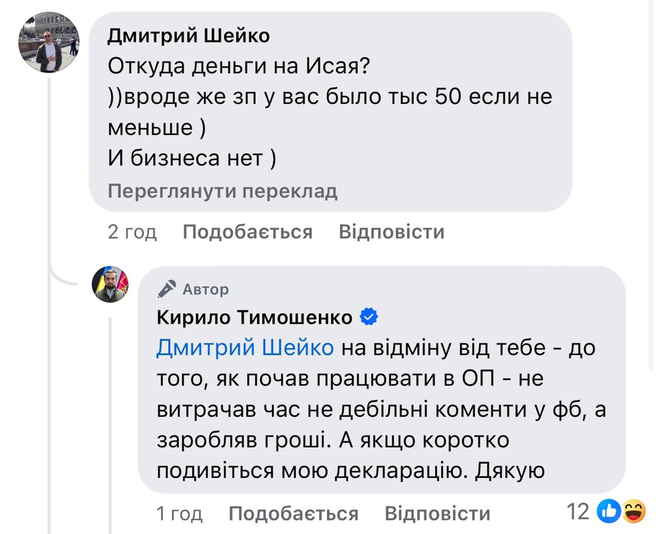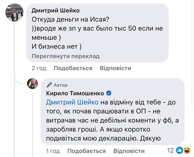 Пользователи социальных сетей резонно спросили, откуда средства на такую «лакшери лайф», на что Кирилл Тимошенко ответил «на ты», что во время работы в Офисе президента зарабатывал немалые деньги, а не «писал дебильные комментарии в ФБ».