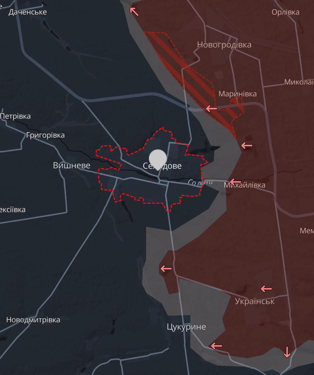 Сегодня Deep State сообщил о захвате россиянами села Мариновка и широкой территории к юго-западу от Новогродовки. Это направление ведет к Селидово с северо-востока.