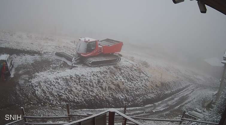 Снег выпал и на горнолыжном курорте Буковель - вебкамера с верхней станции подъёмника 5 показывает заснеженную трассу, а температура воздуха составляет - 2.5°C.