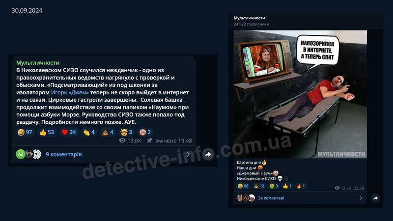 В конце сентября 2024 года в стенах Николаевского следственного изолятора произошел конфликт между арестантами, по результатам которого 33-летний криминальный авторитет Игорь Джемерчук по прозвищу "Джем", считающийся так называемым "смотрящим" за учреждением со стороны представителей преступного мира, во время драки сломал нос 57-летнему "бродяге" Сергею Кругликову по прозвищу "Квадрат".