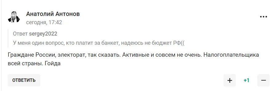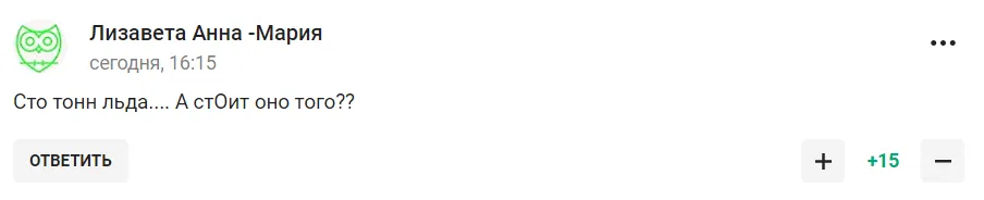 "Деньги на ветер", "Заплатят граждане России, электорат, так сказать. Активные и не очень. Налогоплательщики всей страны. Ура", "У индийцев есть пословица: "От глупости нет лекарств!", "Сто тонн льда... А стоит ли это того?", "Полный маразм, вызывающий рвотный рефлекс, праздник во время чумы", "Песков часы продал?", "Вспомнил, чья она жена... И сразу всё стало на свои места" - шутят пользователи.