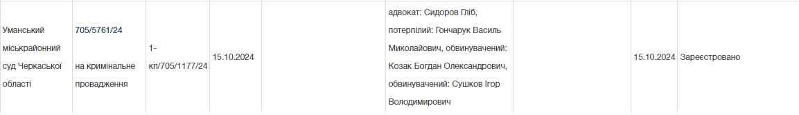 Речь идет о деле, в рамках которого "Суше", как уже сообщалось на страницах Dетектив-Info, инкриминируется распространение преступного влияния (ч.1 ст.255-1 УК Украины), и, с привлечением своего доверенного лица - 26-летнего Богдана Козака, в причастности к попытке организации убийства судьи Уманского горрайонного суда Василия Гончарука (п.12 ч.2 ст.115 УК Украины) и незаконному обороту оружия (ч.1 ст.263 УК Украины).