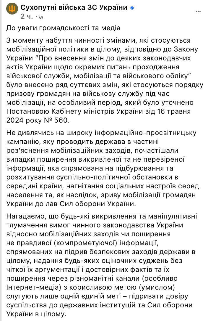 В ВСУ предупредили об уголовной ответственности за распространение фейков о мобилизации. Неправдивая информация подрывает доверие общества к государственным институтам и Силам обороны Украины.
