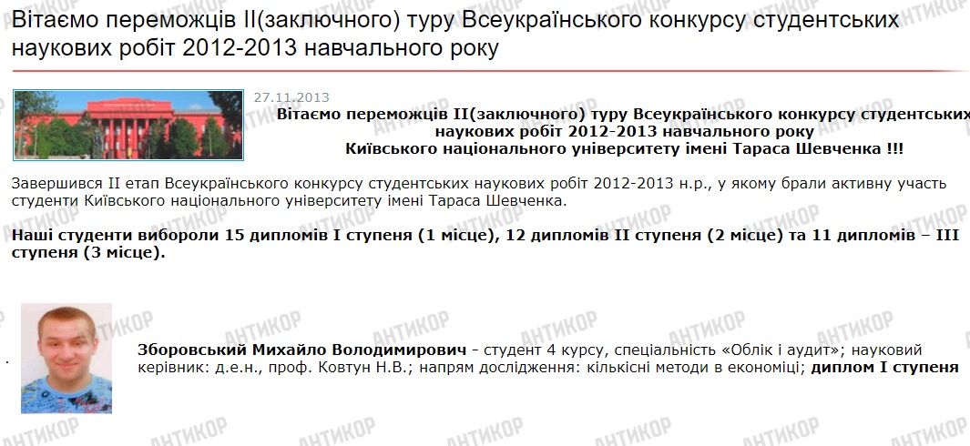 Годом позже, уже на четвертом курсе, он получил диплом первой степени на Всеукраинском конкурсе студенческих научных работ. Направление его исследования касалось количественных методов в экономике.