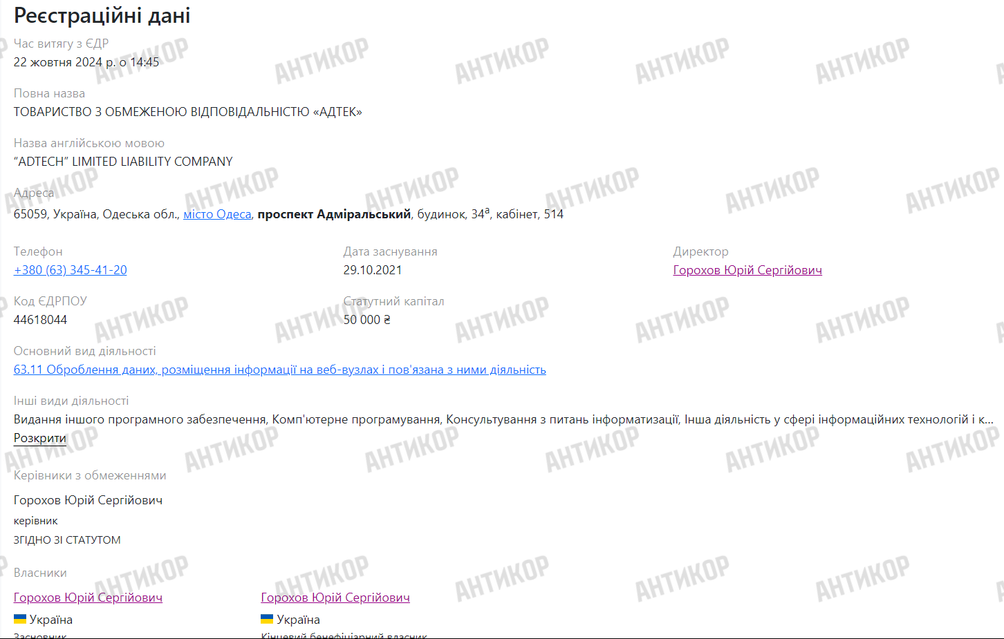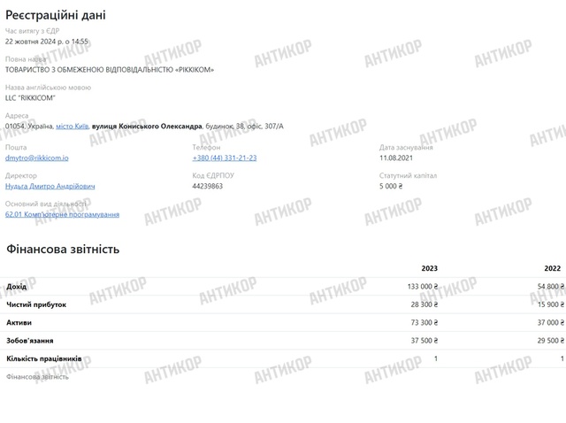 Авторы его растиражированной биографии сообщают, что в качестве программиста он обслуживал ООО "Адтек", ООО "Эпик медиа" и Rikkicom. В первом из них в 2023 году официально работал всего один сотрудник, а уставный капитал составляет 50 000 гривен.