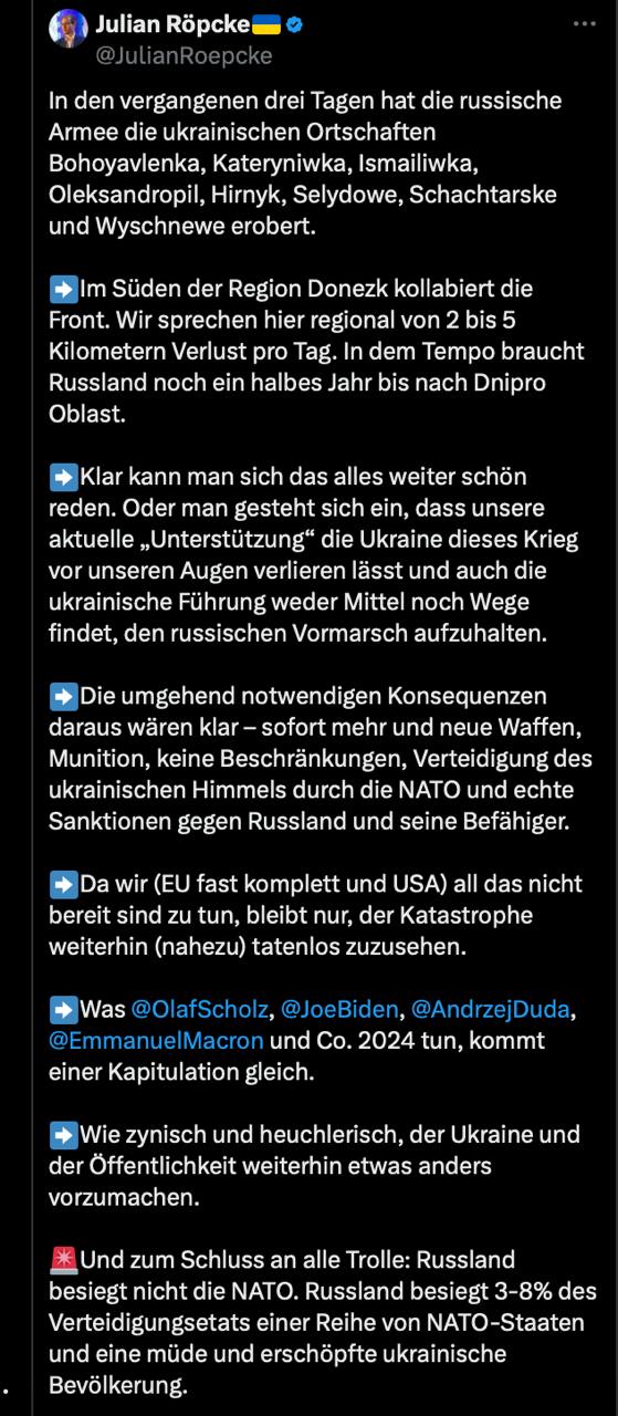 «Можно признать, что наша текущая «поддержка» приводит к тому, что Украина проигрывает эту войну прямо на наших глазах, и что украинское руководство не может найти никаких средств или способов, чтобы остановить наступление России», - пишет Рёпке.