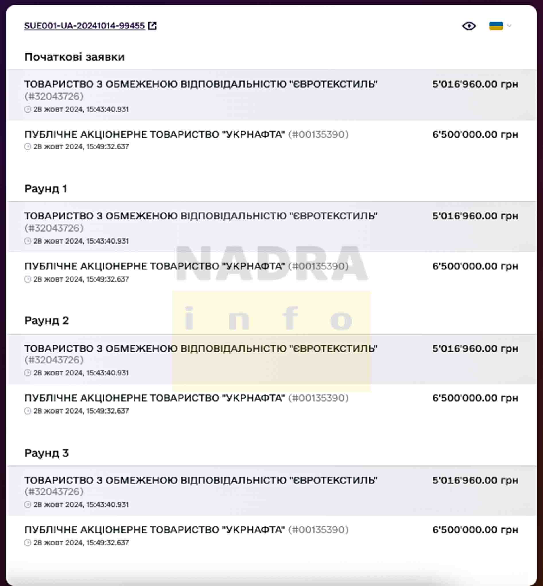 На аукцион 29.10.2024 зарегистрировались два участника: ПАО «Укрнафта» и ООО «Евротекстиль» Вадима и Светланы Григорьевых (YouControl).