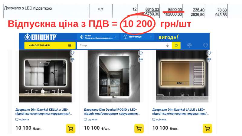 Зеркала с LED подсветкой планируют приобрести за 10200 грн/шт. "Эпицентр" за такую цену предлагает зеркала не только с подсветкой, но и со смартпанелью и подогревом.