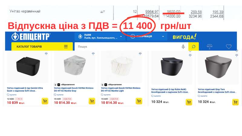 Один унитаз обойдется в 11400 грн. В октябре унитаз Cersanit President с бачком и сиденьем для укрытия в Лубнах стоил 6 000 грн . Даже унитазы Nando Rimless, как в модульных домах ХАЭС , в «Эпицентре» продаются дешевле – 10 790 грн с ершиком, а по заложенной в смете цене магазин предлагает подвесные унитазы – черные, серые и под мрамор .
