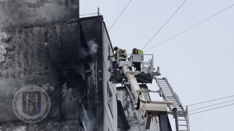 В Святошинском районе столицы из-за атаки дронов произошло возгорание на площади 50 м2 и частичное разрушение квартир на 15 и 16 этажах 16-этажного жилого дома.