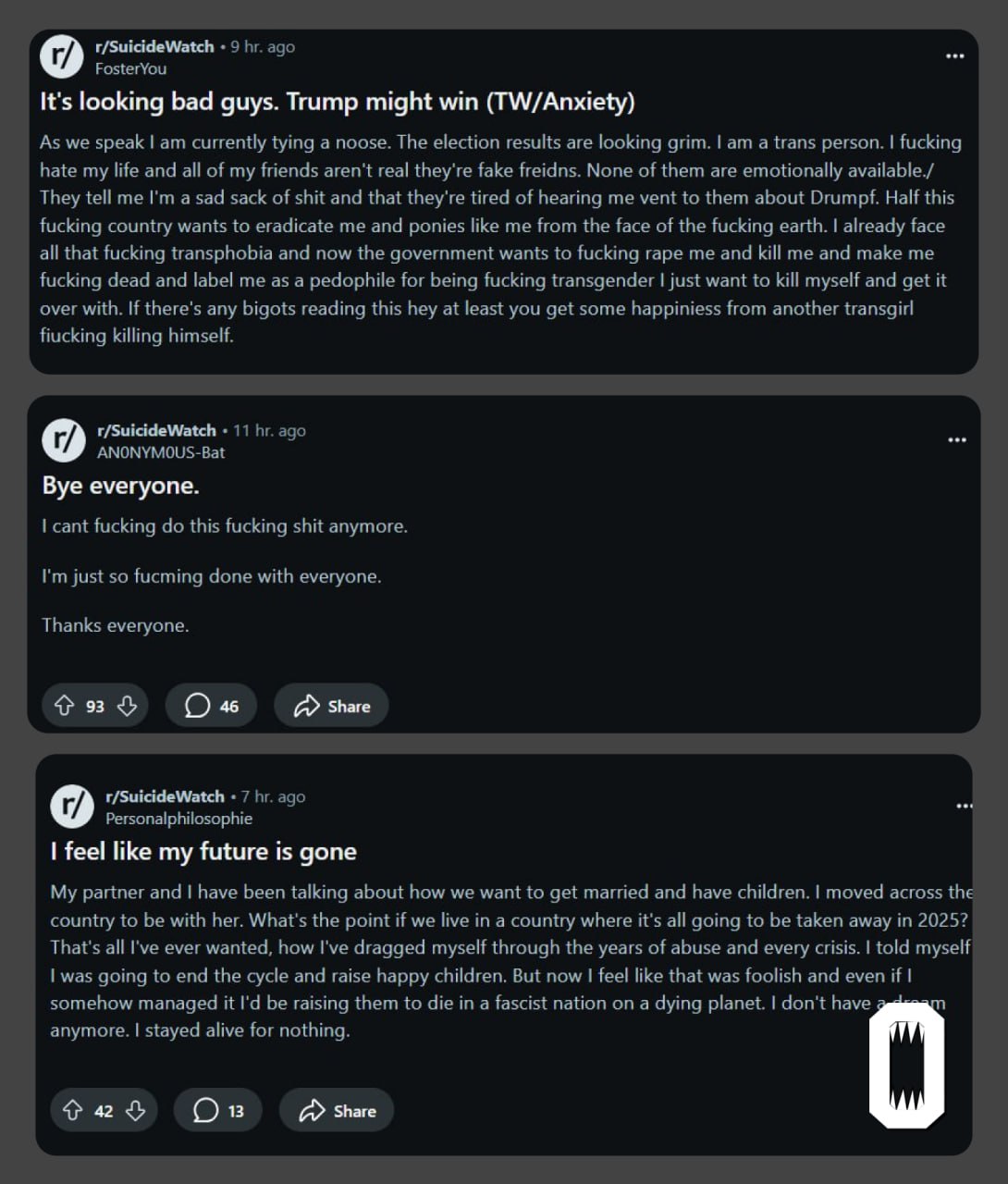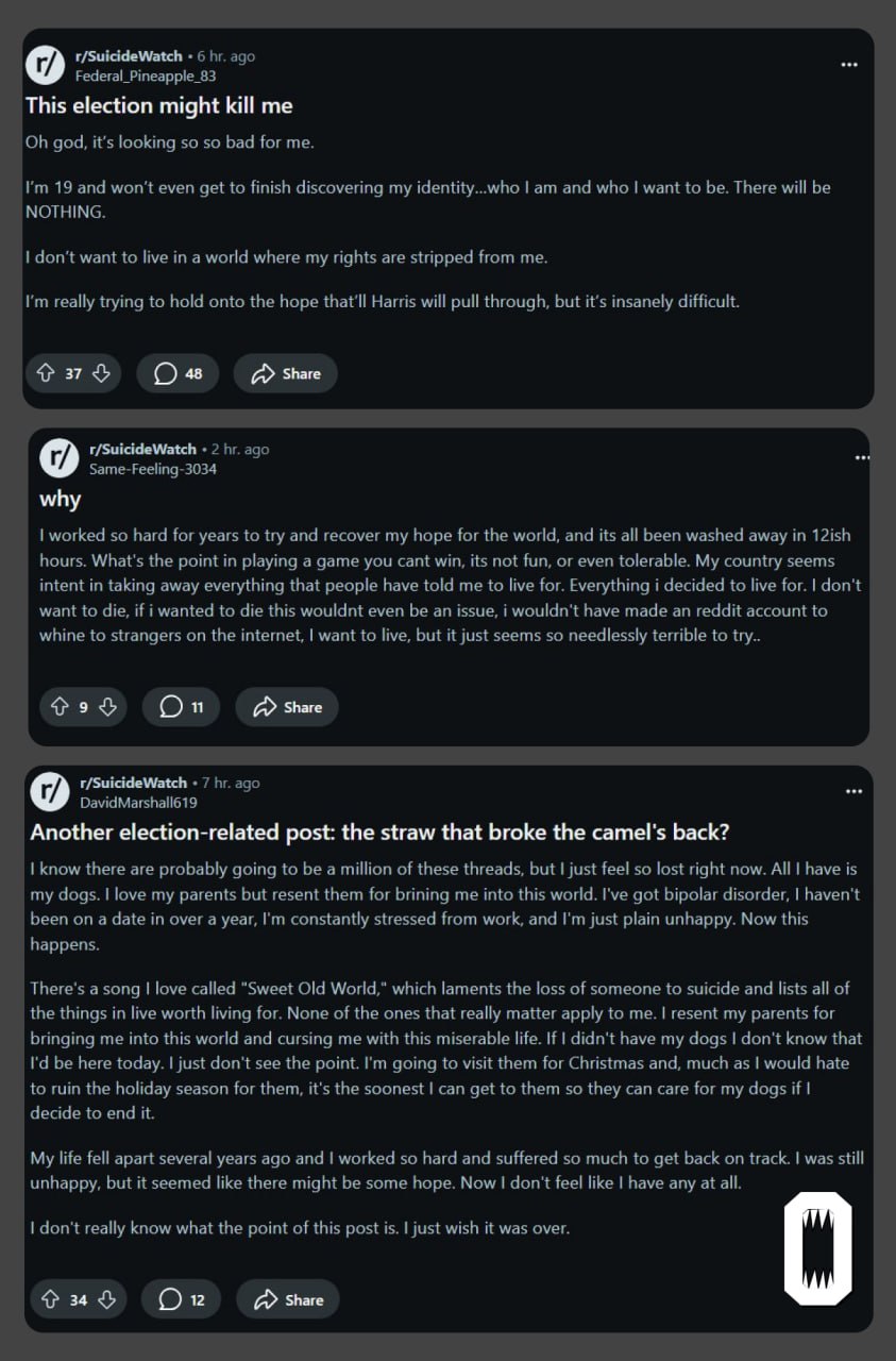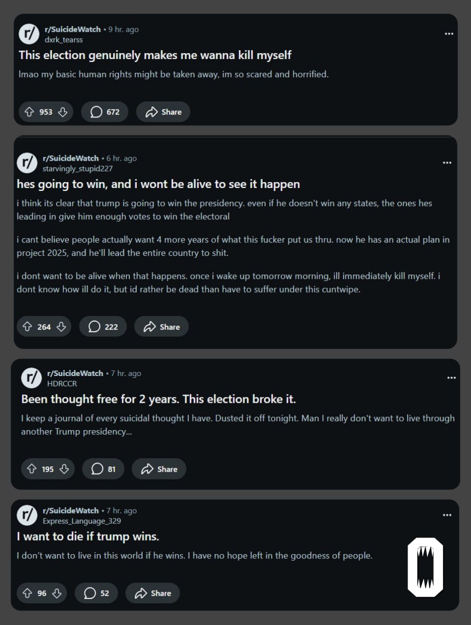 Большая часть из них касается победы Трампа. Многие американцы опасаются, что это может разрушить их жизнь и превратить США в диктатуру с массовыми репрессиями. Один из пользователей пишет, что его партнер живет в Мексике, и теперь они не смогут видеться. Другой полагает, что Трамп будет оказывать давление на ЛГБТК+*- сообщество и уничтожит права человека и демократию.
