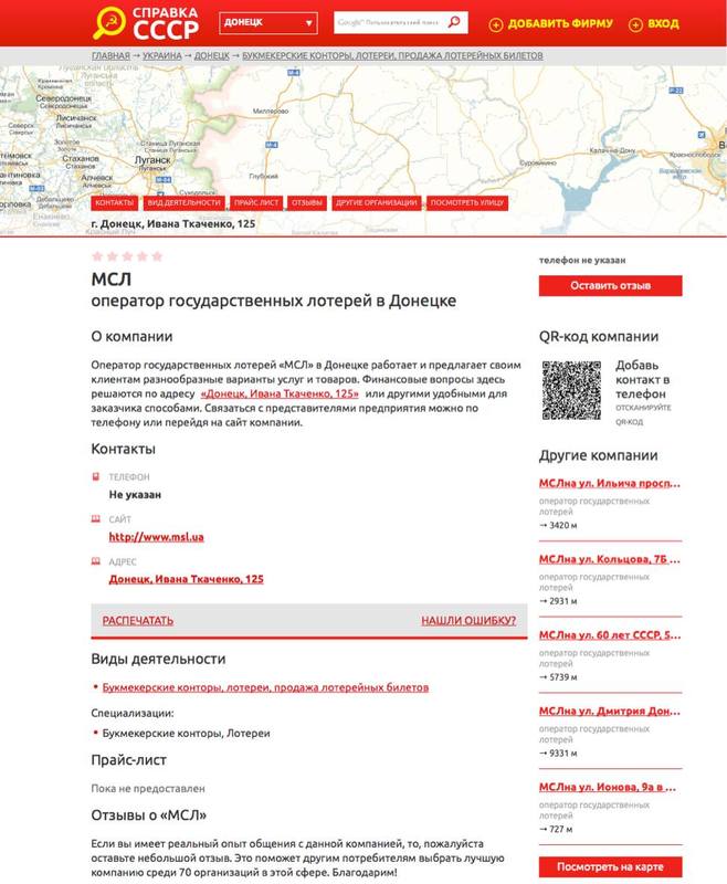 Кроме этого, на информационном ресурсе «Справка СССР», время, создание которого датировано 2015 годом, можно найти информацию касательно адресов размещения торговых точек оператора «МСЛ» в Донецке.