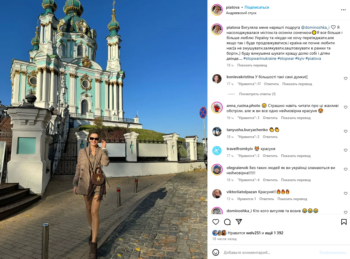 "Я любовалась городом и осенним солнышком. Я все больше и больше люблю Украину и никуда не хочу переезжать, но если так будет продолжаться, и страна не будет любить нас (а не заставлять, пугать, загонять в рамки и долги), буду вынуждена искать лучшую долю себе и детям в другом месте", – написала Пятова.