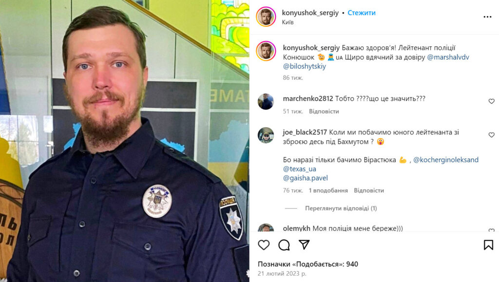 Наш разговор с Сергеем Конюшко был довольно коротким. Он сказал, что комментариев не будет. Мы направили запрос в Национальную полицию Украины с вопросом, действительно ли и когда Сергей начал работать в департаменте патрульной полиции. К моменту публикации материала ответа мы не получили.