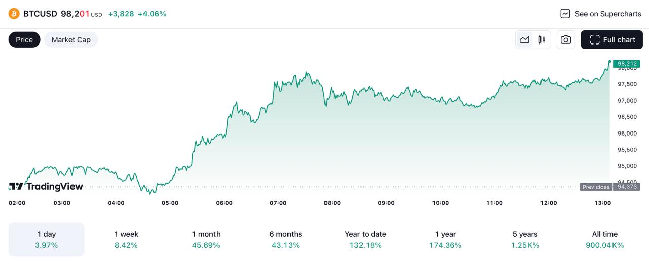 Цена биткоина побила исторический рекорд, превысив отметку в 98 тысяч долларов.