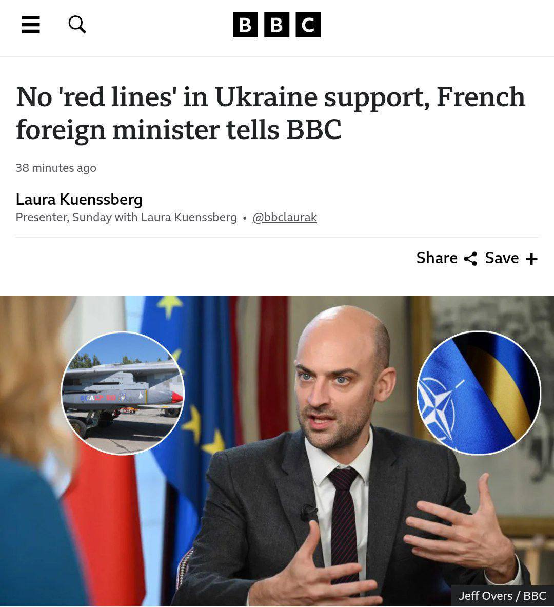 Министр иностранных дел Франции Жан-Ноэль Барро подчеркнул, что страна не намерена устанавливать "красные линии" в поддержке Украины, допуская возможность участия французских военных в войне с Россией.