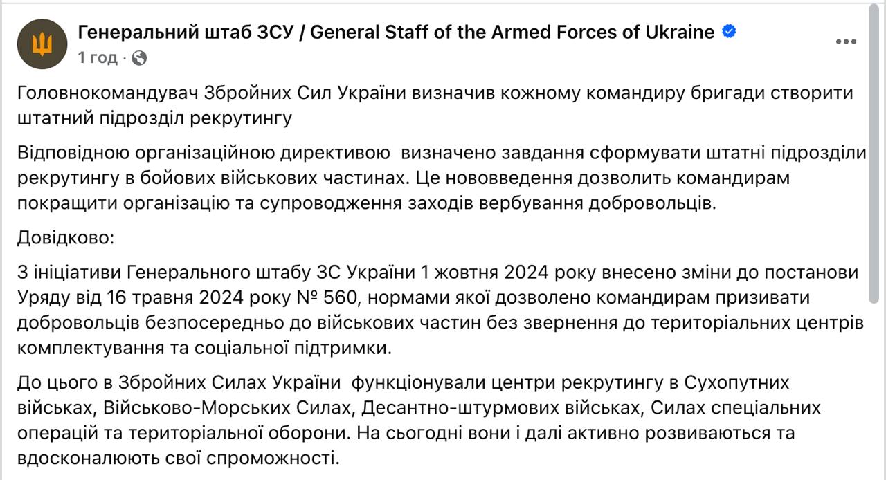 Генерал Сырский дал распоряжение командирам бригад сформировать в каждой части штатное рекрутинговое подразделение, сообщает Генштаб.