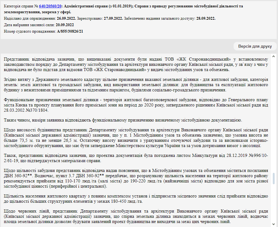 При этом, в интервале между выдачей МУО и разрешения на строительство, в августе 2020 года, в Окружной админсуд Киева (ОАСК) поступил иск об отмене указанных "градостроев". Истцом выступил житель одного из соседних домов Николай Гуриненко. В обоснование своих требований этот гражданин, в частности, указал тот факт, что, мол, Генпланом Киева на этой территории разрешен возведение домов высотой до 27 метров, тогда как в МУО была отмечена высотность до 73,5 метров. Также, среди прочего, Николай Гуриненко отметил, что этот участок в свое время подпадал под комплексную застройку соседних домов по ул. Старонаводницкой (т.е. фактически была их придомовой территорией).