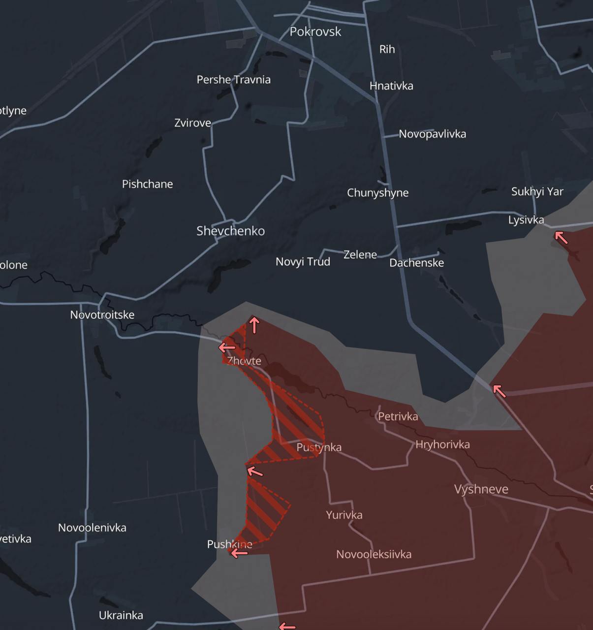 «Южнее населенного пункта Пушкино враг начал двигаться в сторону Украинки. До восточных окраин им осталось пройти около одного километра. Кроме того, продолжается движение к трассе Покровск-Курахово, до которой осталось три километра. В направлении Желтого противник также продвинулся на запад и достиг окрестностей Новопустынки. Таким образом, происходит расширение прорыва вдоль железной дороги на Покровск и создается угроза окружения с западной стороны», - отмечает военный.