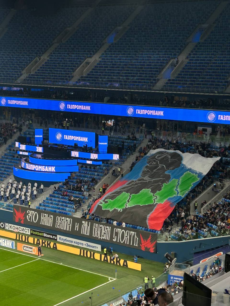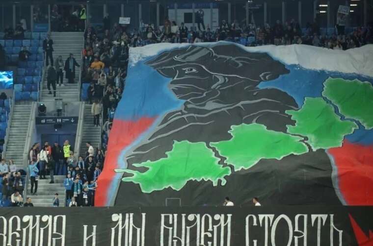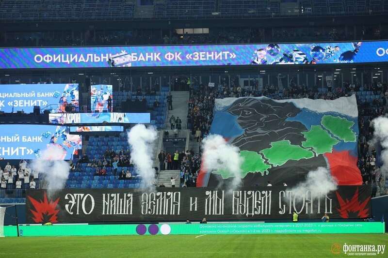 Во время матча 18-го тура чемпионата России по футболу между клубом "Зенит" и "Акроном" поклонники питерской команды развернули баннер в поддержку полномасштабного вторжения в Украину. На баннере изображены границы так называемых ДНР, ЛНР, а также Херсонской и Запорожской областей на фоне российского флага и силуэта солдата.
