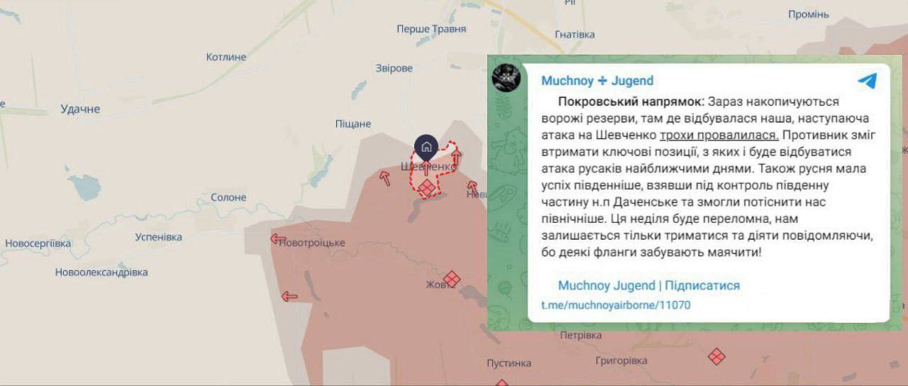 Военная операция, запланированная на Шевченко, потерпела неудачу. Противник сумел удержать ключевые позиции, с которых планируется атака в ближайшие дни", - сообщает военный с позывным Мучной.