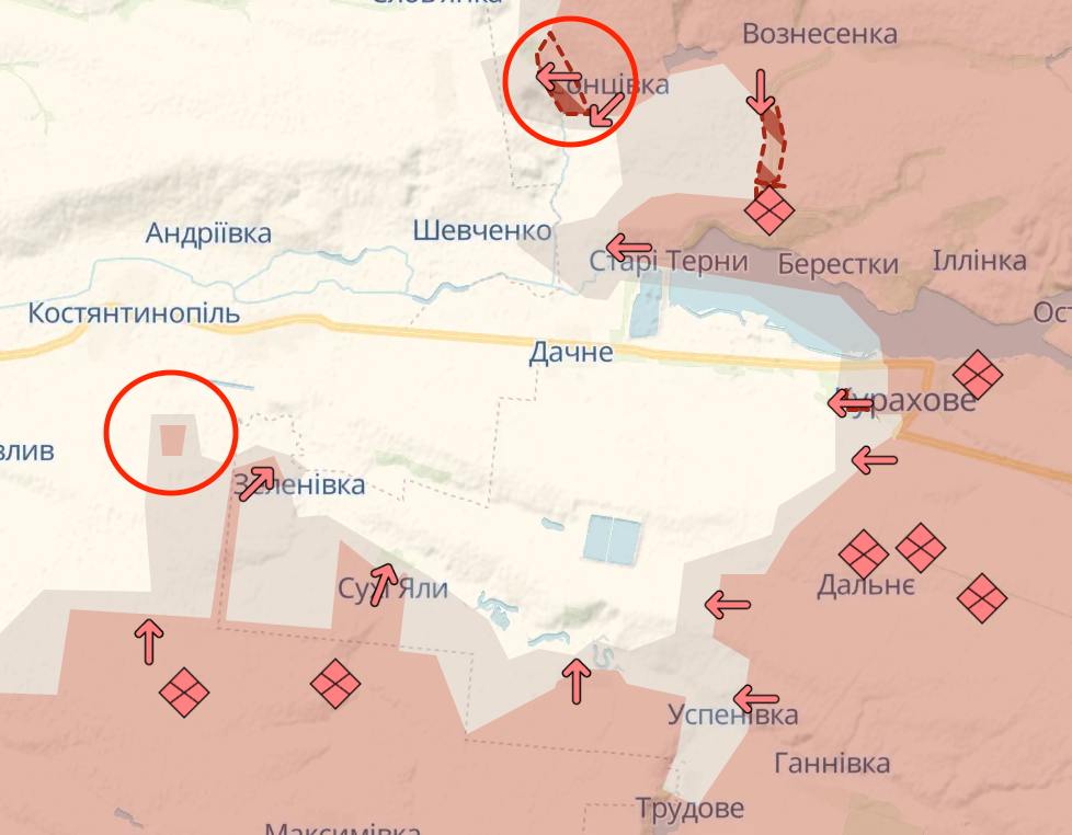 Согласно карте DeepState, российские силы взяли под контроль Сонцевку на северной стороне, а на юге захватили участок в поле к северо-западу от Зеленовки, находящийся примерно в двух километрах от дороги к Курахово.