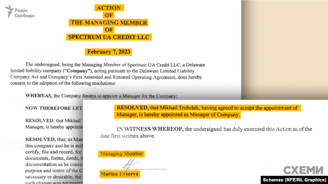 В распоряжении журналистов есть документ, которым Марина Евсеева в качестве управляющего члена правления назначила Трубчика управителем Spectrum UA Credit LLC, уполномочив его руководить не только этой американской компанией, но и принимать решение относительно ее дочерней украинской структуры «Спектрум Эссетс». Это произошло 7 февраля 2023 года во время полномасштабной войны.