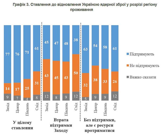 Социологи акцентируют, что во всех регионах большинство – от 61% на Востоке до 77% на Западе – в целом поддерживает восстановление ядерного оружия.